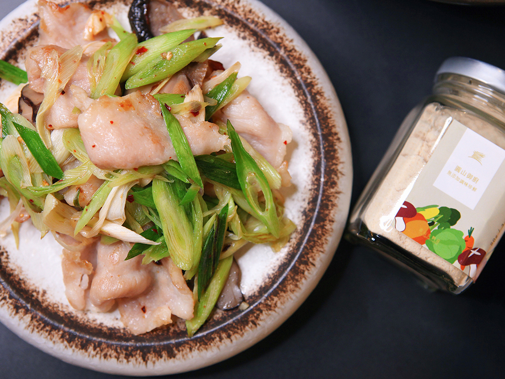 蒜苗 100g、松阪豬 180g、薑 5g、蔥 30g、蒜 5g、北菇片 23g、圓山御廚無添加調味珍鮮 3g