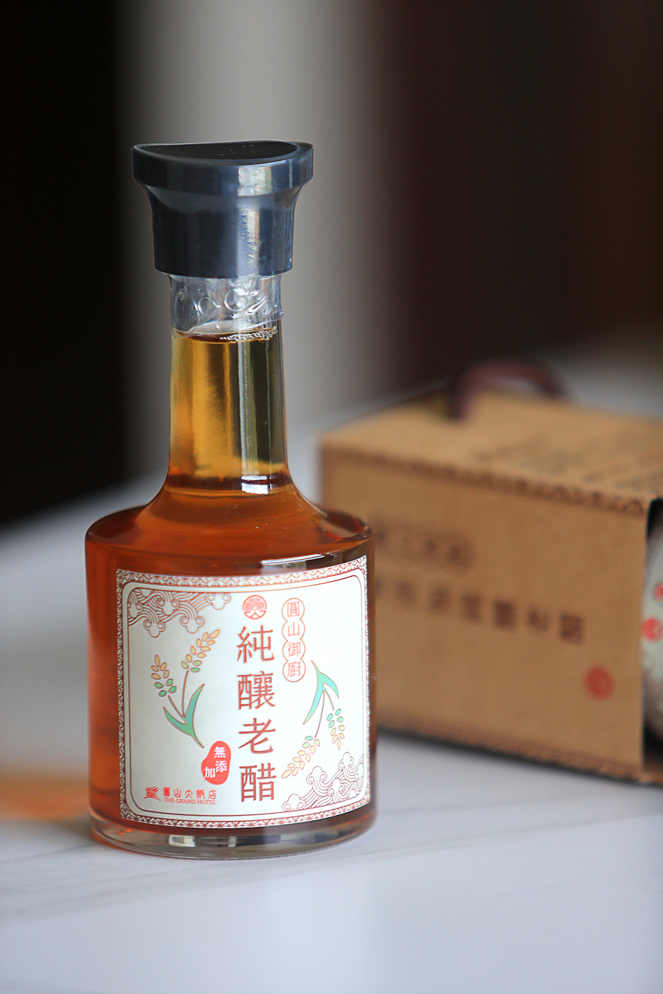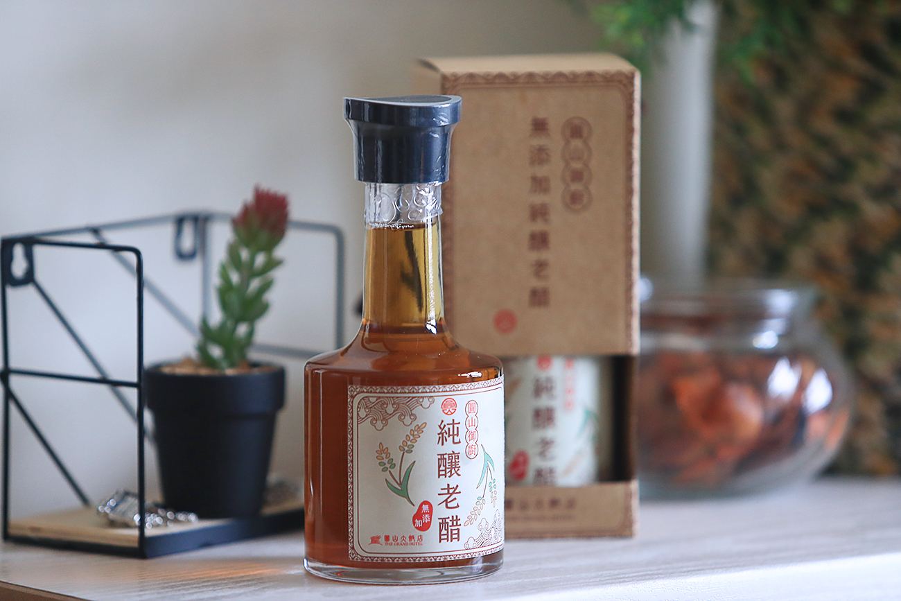 使用天然材料,以古法釀製醋品。以圓糯米熬煮,連同恆溫二十五度下生長的小麥草於老醋甕中發酵一年以上來增加其絕佳風味,是一瓶無香料、無防腐劑、無糖、無焦糖染色、無化學添加的陳年好醋